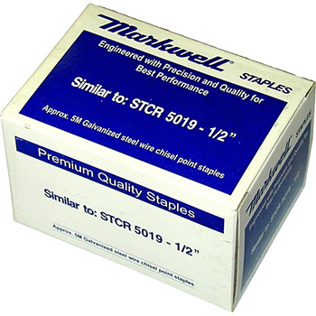 STCR5019 Staples are manufactured by Markwell. Staples measure 1/2″ and are made from galvanized steel wire with chisel points.